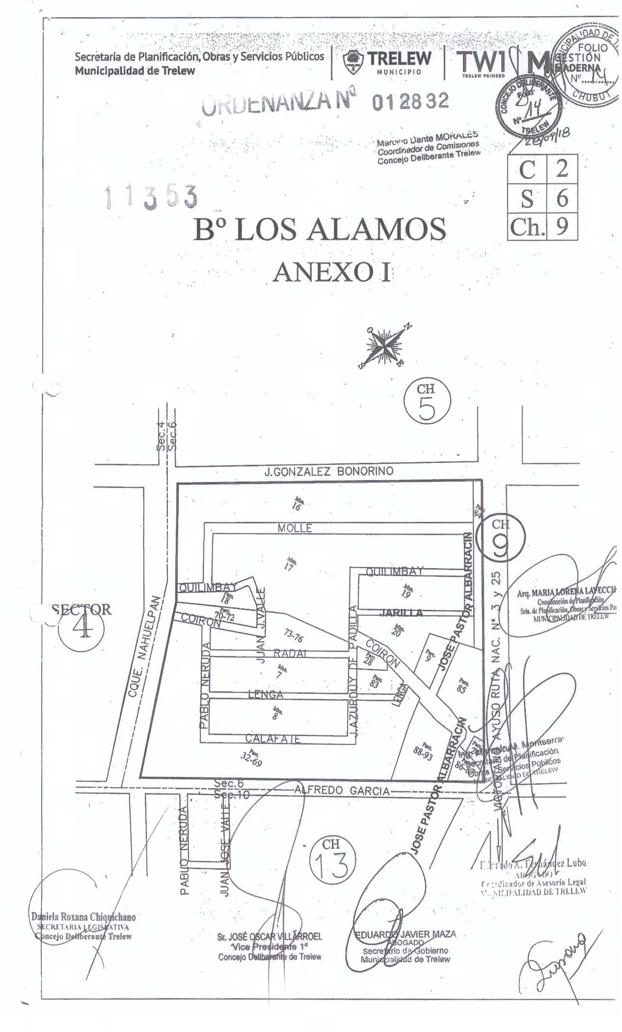 ARTÍCULO 1ro.): AMPLIASE los límites del Barrio Parque LOS ALAMOS, quedando delimitado por las calles: González Bonorino, Victoriano Ayuso, Alfredo García y Cacique Nahuelpán, de acuerdo al ANEXO I, que es parte de la presente.