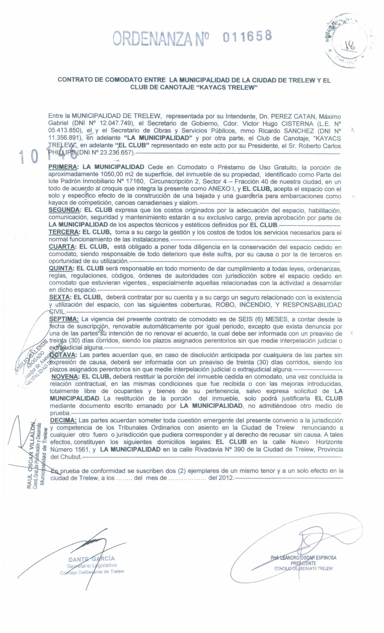 ORDENANZA N° 11658 /12, CONTRATO CLUB CANOTAJE “kayaks tw”.