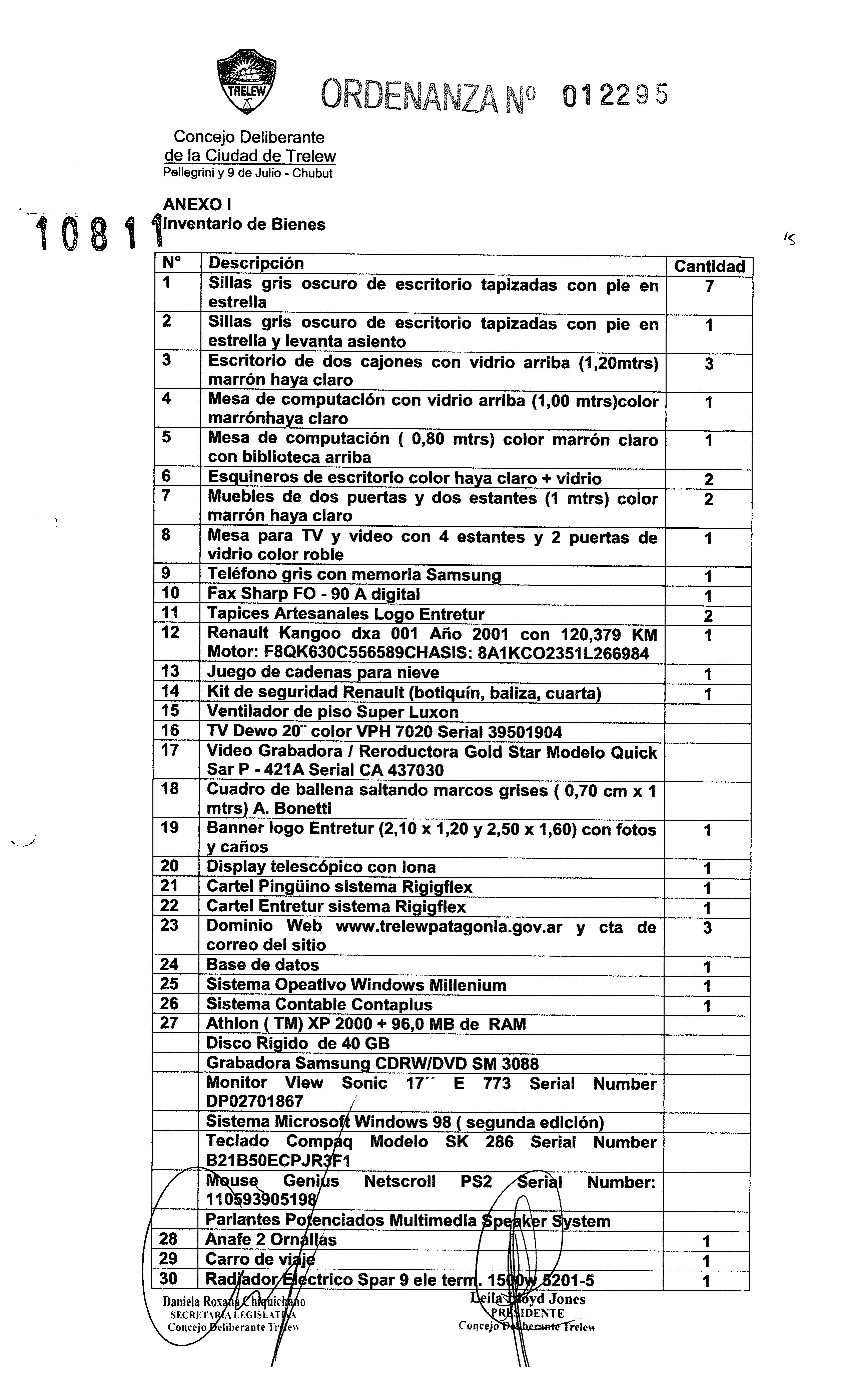 ARTICULO 38vo.): Apruébese el inventario de bienes propiedad del ENTRETUR, detallado en Anexo I de la presente Ordenanza.