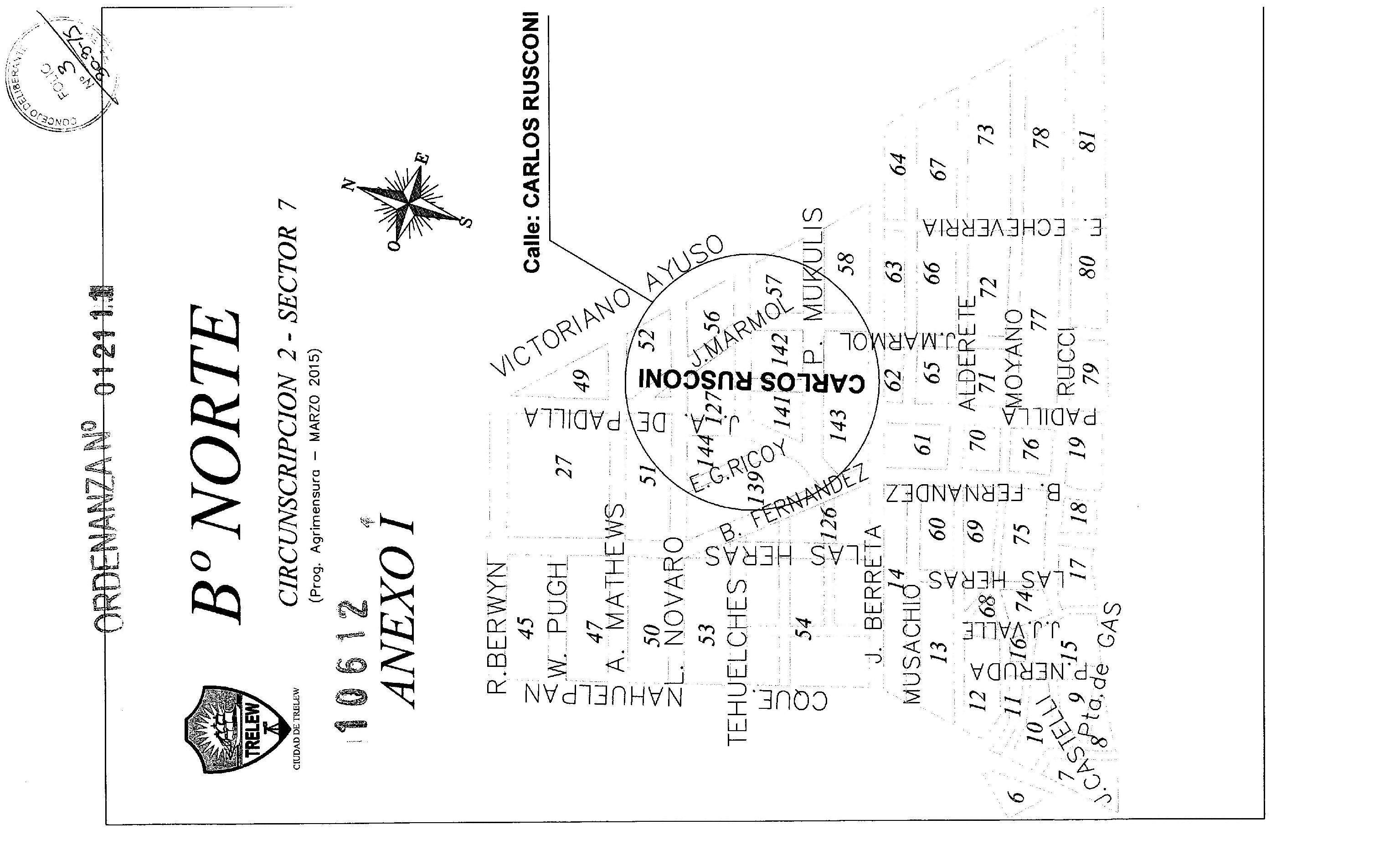 ARTÍCULO 1ro.): DESIGNASE con el nombre de CARLOS RUSCONI a la arteria y su proyección, ubicada entre las actuales manzanas 141 y 142 de la circunscripción 2, sector 7 de acuerdo al Anexo I.