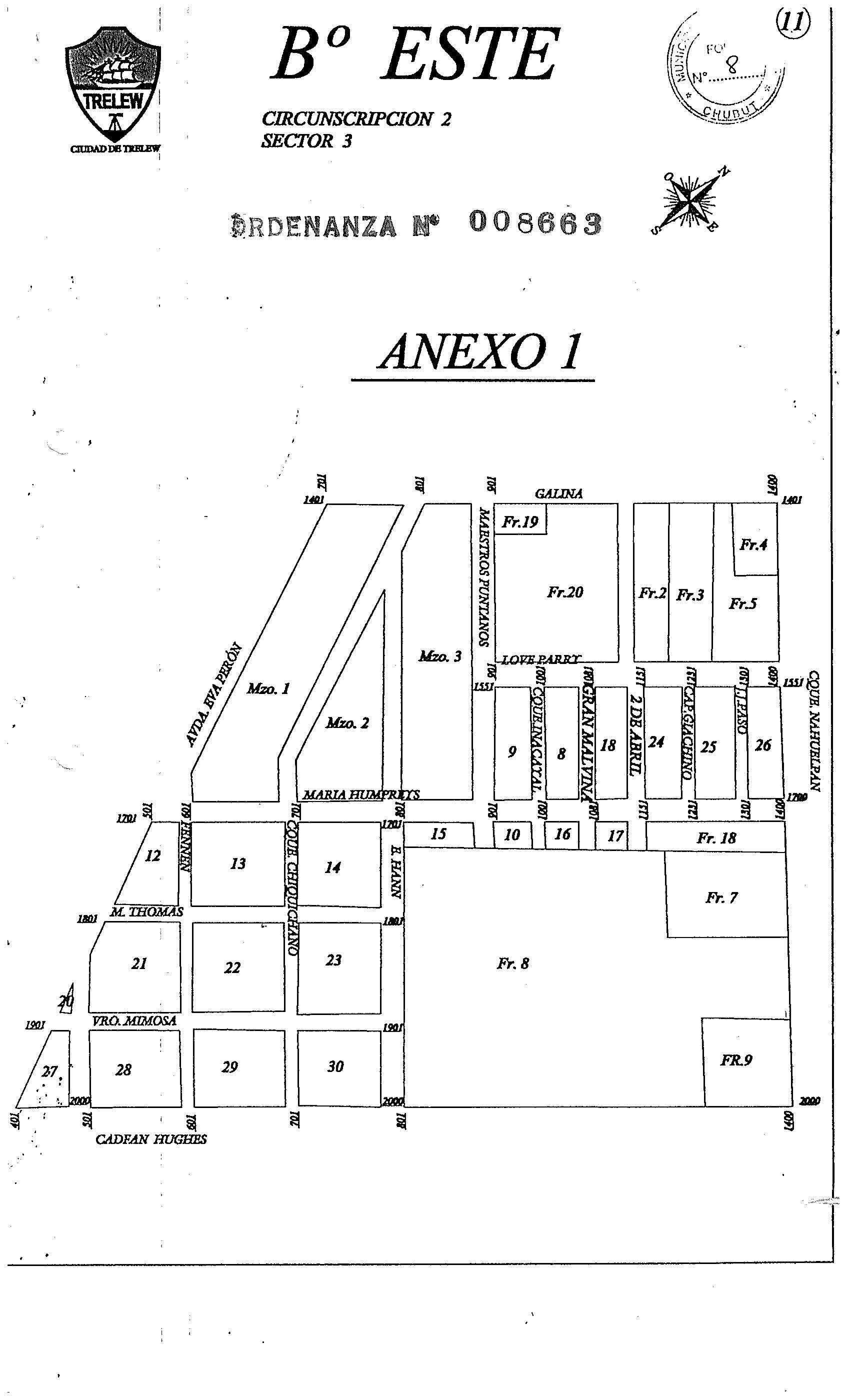 ARTÍCULO 1ro.): Asignase los siguientes nombres a las calles, dentro del ejido del Barrio Este, que actualmente carecen de denominación: “2 de Abril” a la calle que corre de Sur a Norte Love Parry y María Humphers, paralela e inmediata a Capitán Giaquino, “Gran Malvina” a la calle que corre de Norte a Sur, paralela inmediata a Cacique Incayal, Love Parry y María Humphers, ambas según plano que se adjunta.