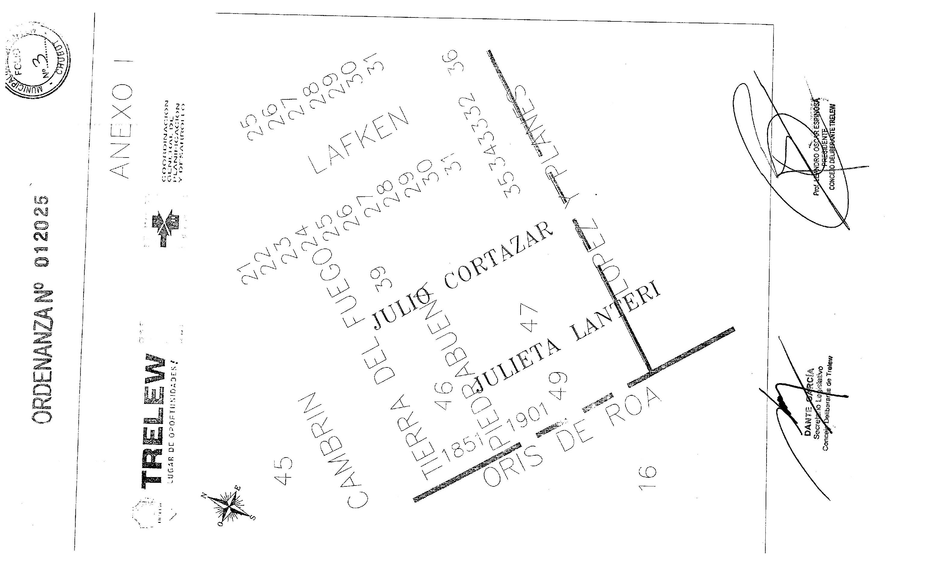 ARTÍCULO 2do.): Designase con el nombre de JULIETA LANTERI a la arteria, y su proyección, ubicada al NE de la actual manzana 49, del sector 8, de la circunscripción 4. De acuerdo al anexo I de la presente Ordenadaza.